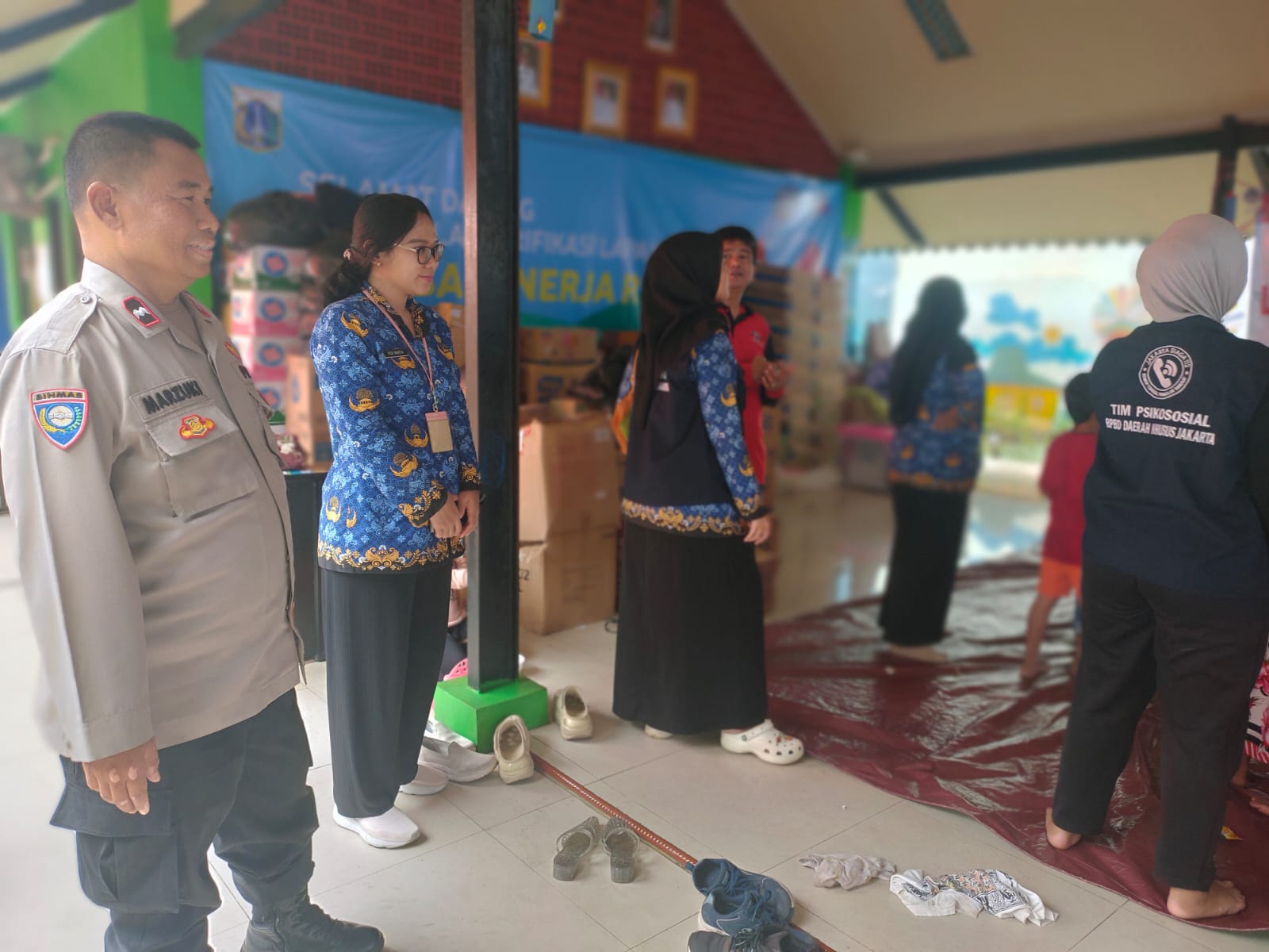 Monitoring dilakukan oleh Aipda Marzuki selaku Bhabinkamtibmas Kelurahan Senen, bersama petugas Satpol PP, guna memastikan kondisi warga pengungsi tetap terpantau dengan baik.