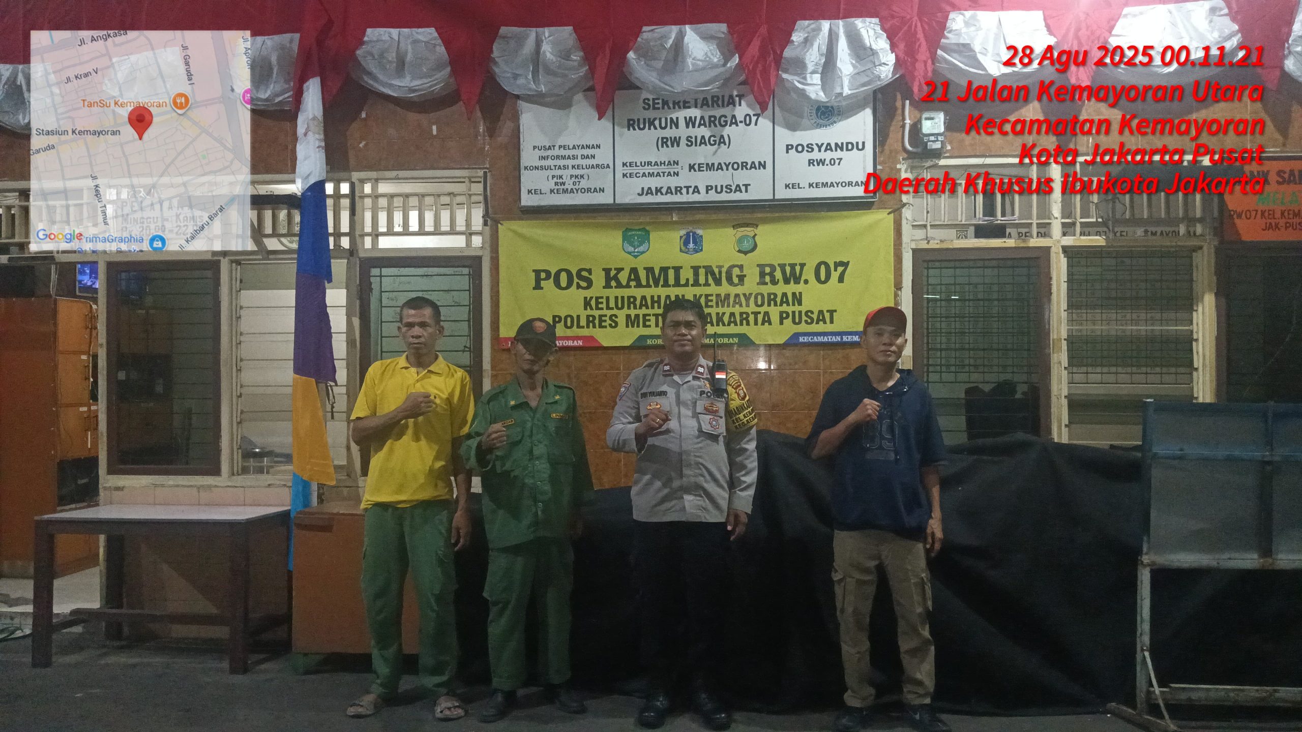 Jakarta Pusat|TribunX.id, Sinergi antara aparat kepolisian dan masyarakat terus diperkuat melalui kegiatan patroli dan sambang pos kamling. Pada Kamis (28/8/2025) dini hari pukul 00.20 WIB, Bhabinkamtibmas Kelurahan Kemayoran, Aiptu Dwi Yulianto bersama anggota Pokdarkamtibmas melaksanakan patroli serta menyambangi Pos Kamling RW 07, Kelurahan Kemayoran, Jakarta Pusat.