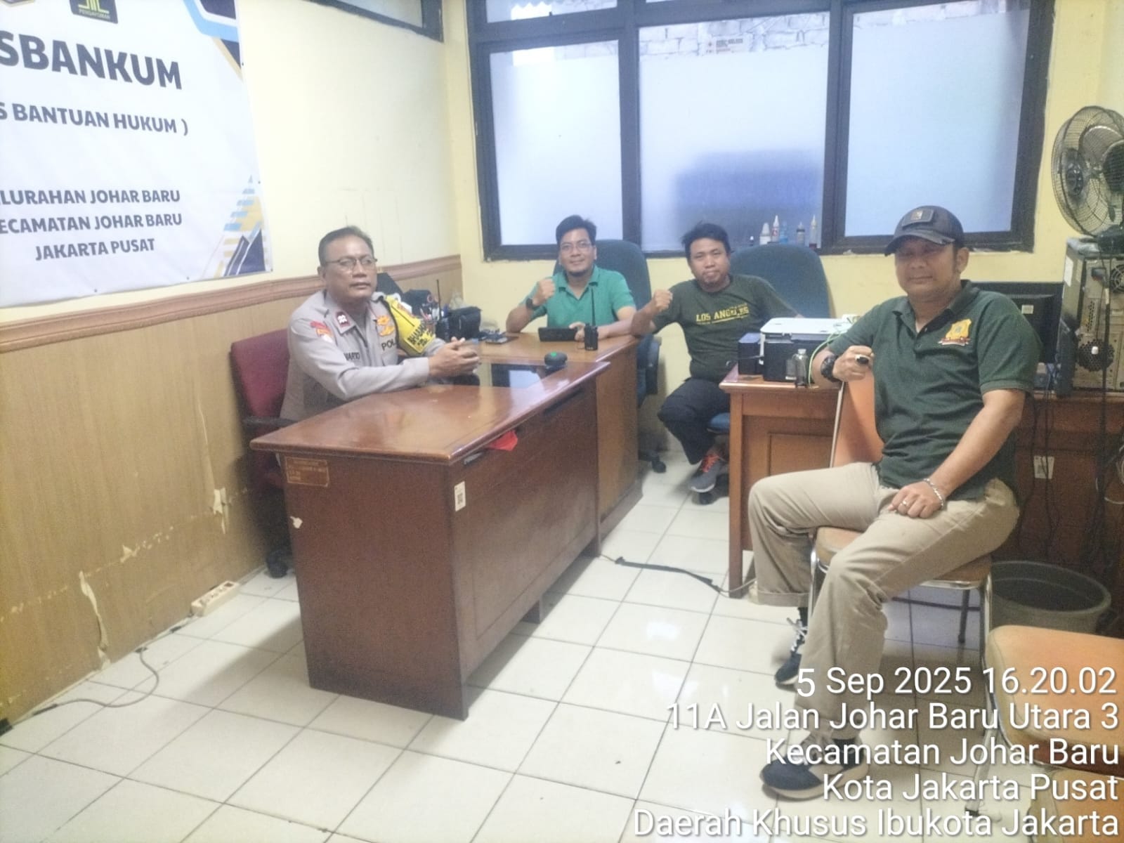 Jakarta Pusat |TribunX.id, Upaya menjaga keamanan dan ketertiban masyarakat (kamtibmas) terus diperkuat Polsek Johar Baru melalui kolaborasi lintas elemen. Pada Jumat (5/9/2025) pukul 15.30 WIB, Bhabinkamtibmas Kelurahan Johar Baru Aiptu Sunarto melaksanakan koordinasi kamtibmas bersama Forum Kewaspadaan Dini Masyarakat (FKDM) bertempat di ruang FKDM, Jalan Johar Baru Utara III RW 03, Kelurahan Johar Baru, Jakarta Pusat.