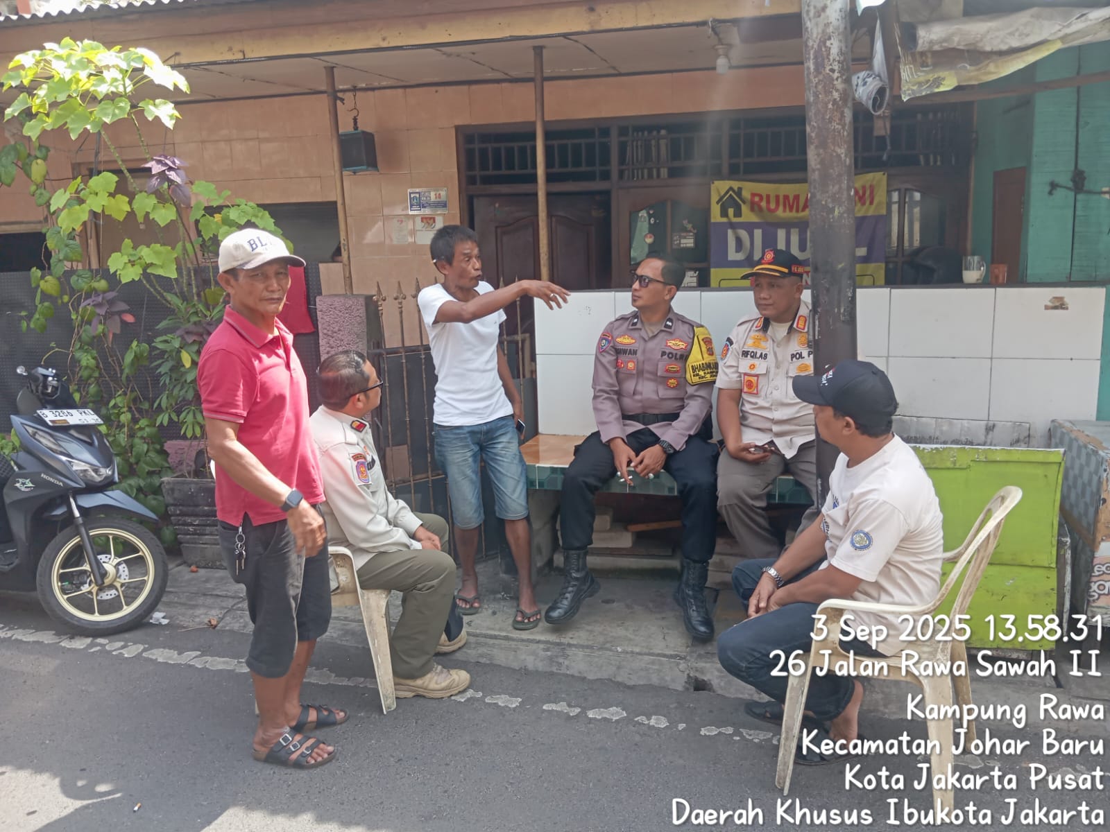 Jakarta Pusat|TribunX.id, Polsek Johar Baru bersama unsur tiga pilar terus memperkuat upaya menjaga stabilitas keamanan di wilayah. Pada Rabu (3/9/2025) pukul 14.00 WIB, Bhabinkamtibmas Kelurahan Kampung Rawa, Aipda Ikhwan, menggelar patroli dialogis sekaligus cooling system di kawasan Jl Rawa Sawah, RT 02 RW 06, Kelurahan Kampung Rawa, Johar Baru, Jakarta Pusat.