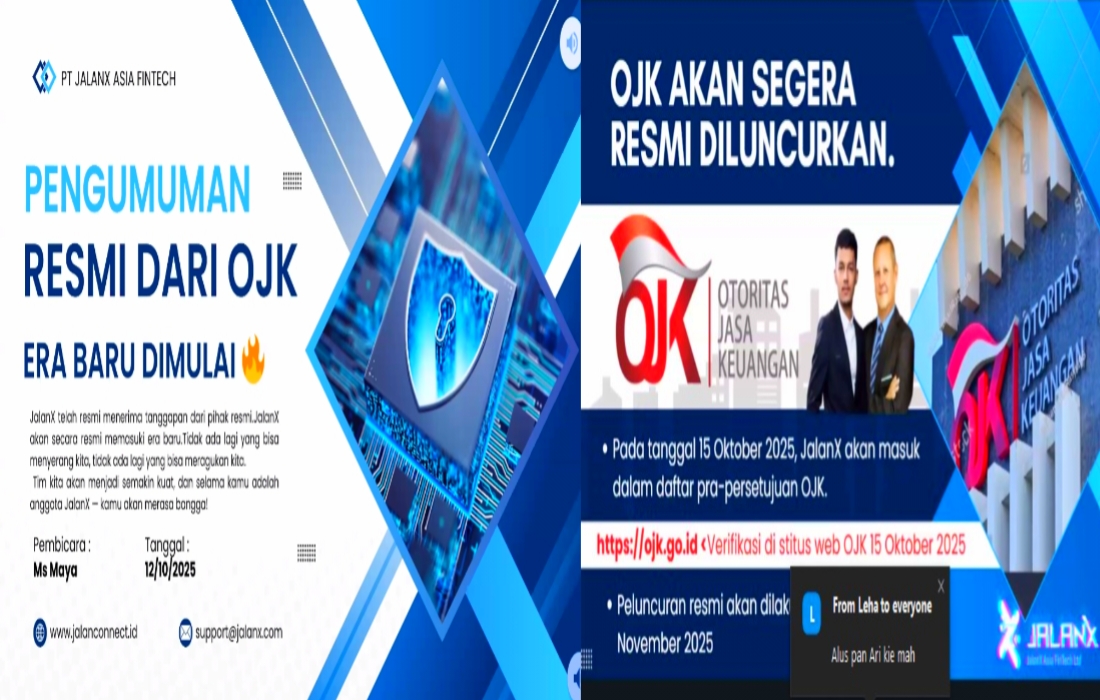 CEO JalanX Ethan G Morgan mengatakan, ” untuk para pengguna di JalanX mohon bersabar karena Otoritas Jasa Keuangan ( OJK ) terjadwal inpeksi mendadak untuk mengaudit keuangan Jalanx baik profit nasabah maupun dividen secara terpisah, terjadwal dimulai tanggal 11 Oktober 2025 sampai 14 Oktober 2025, sementara penarikan profit dibekukan sementara, sudah bisa penarikan profit masing-masing sekaligus verifikasi di situs Web OJK tanggal 15 Oktober 2025 “, ucap Ethan G Morgan di Webinar zoom, pada hari Minggu 12/10/2025, pukul 20.00 WIB.