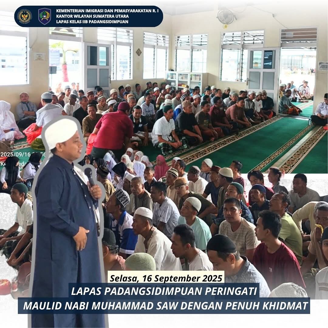 Padangsidimpuan |TribunX.id, Lembaga Pemasyarakatan (Lapas) Kelas IIB Padangsidimpuan menggelar peringatan Maulid Nabi Muhammad SAW 1447 H/2025 M pada Selasa (16/09/2025) di Masjid Al-Ikhlas Lapas. Kegiatan ini diikuti oleh seluruh petugas dan warga binaan dengan penuh antusias dan khidmat.