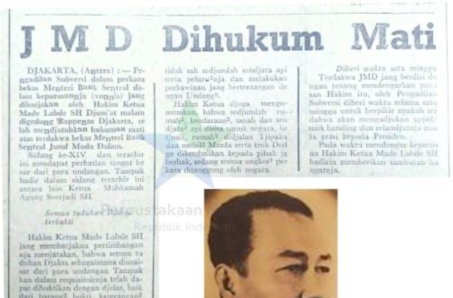 Berita Jusuf Muda Dalam divonis hukuman mati yang dimuat Harian Mertju Suar tanggal12 September 1966. Foto: Perpusnas RI