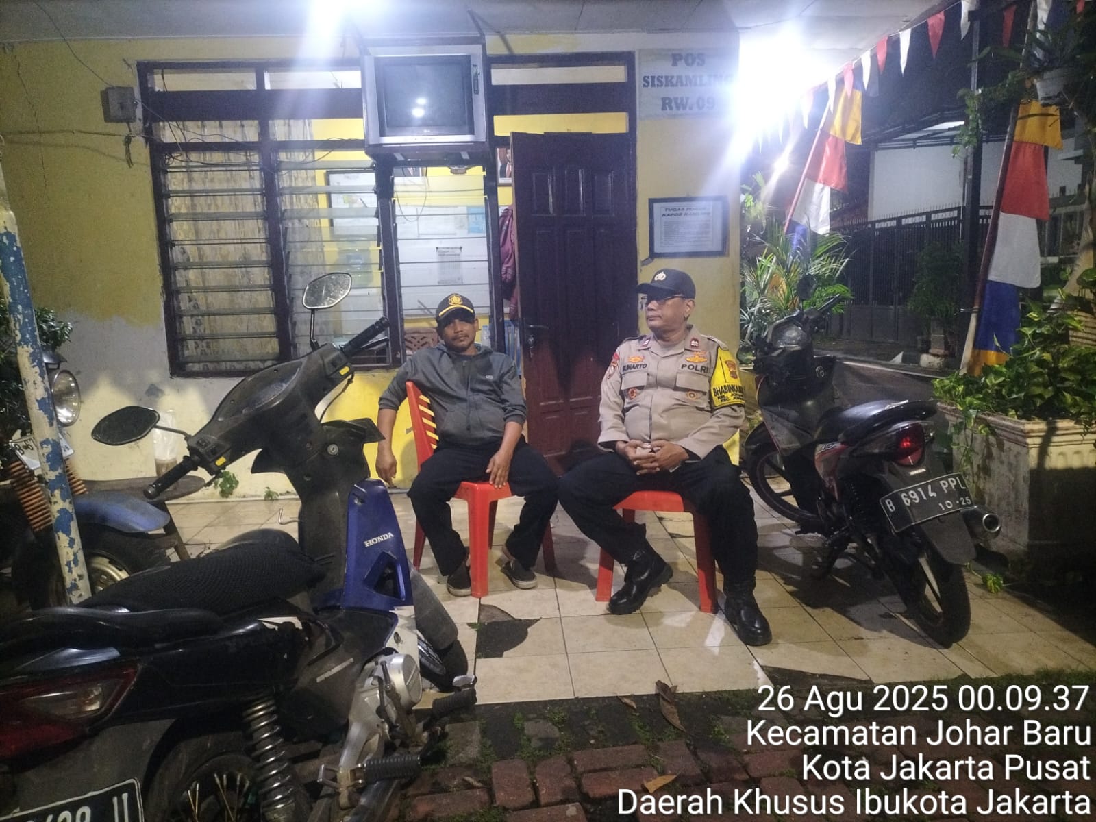 Jakarta Pusat|TribunX.id, Dalam rangka menjaga keamanan dan ketertiban masyarakat, Polsek Johar Baru melalui Bhabinkamtibmas Kelurahan Johar Baru melaksanakan patroli dialogis, sambang wilayah, dan cooling system di Poskamling RW 09, Jl. Johar Baru I, Jakarta Pusat. Kegiatan ini berlangsung pada Selasa (26/8/2025) pukul 01.05 WIB, dipimpin oleh Aiptu Sunarto.