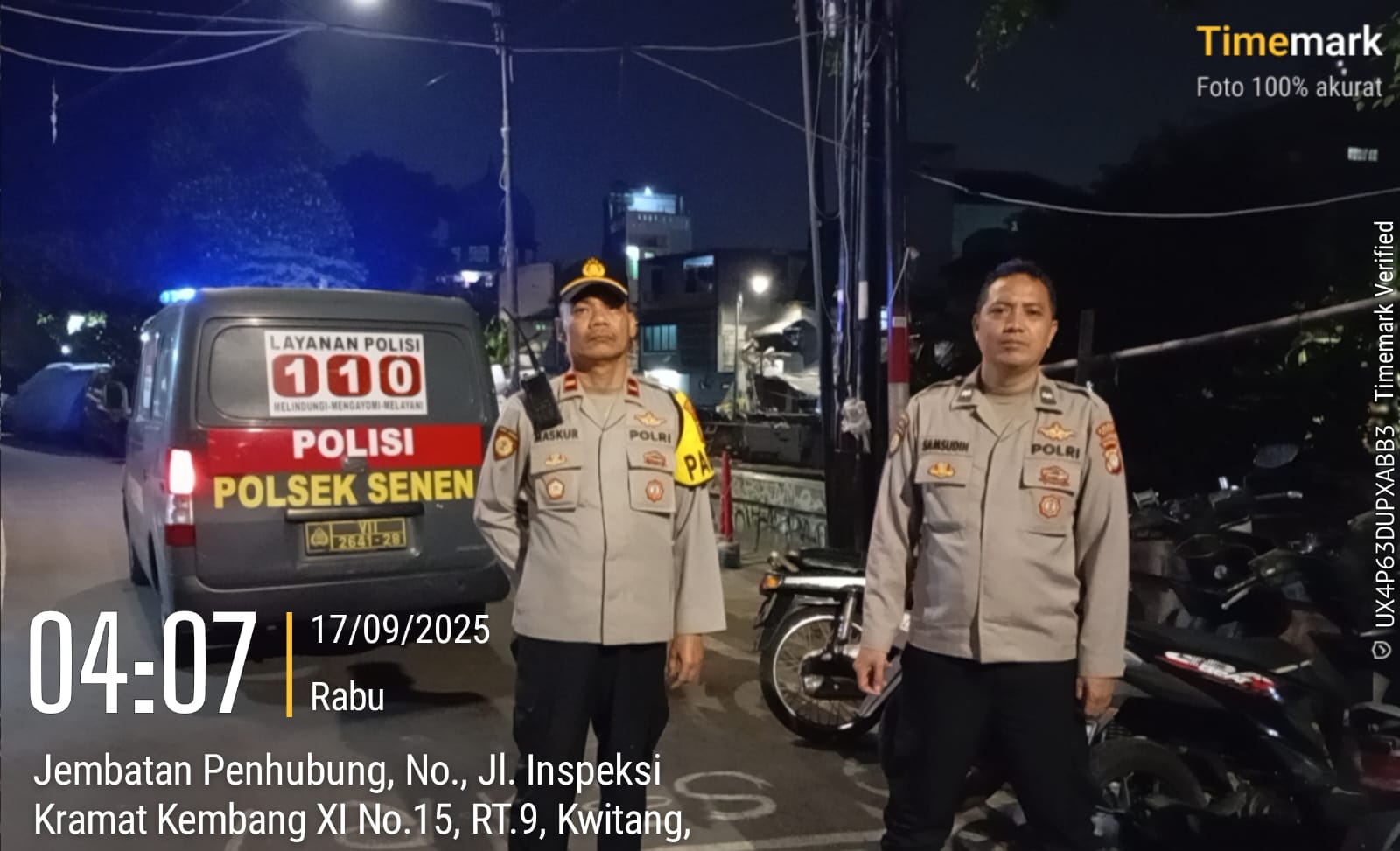 Jakarta Pusat|TrinunX.id, Dalam rangka menjaga situasi kamtibmas tetap aman dan kondusif, jajaran Polsek Senen melaksanakan patroli mobile pada Rabu dini hari (17/9/2025) sekitar pukul 03.00 WIB di kawasan Jl. Kembang VII, Kelurahan Kwitang, Kecamatan Senen, Jakarta Pusat.