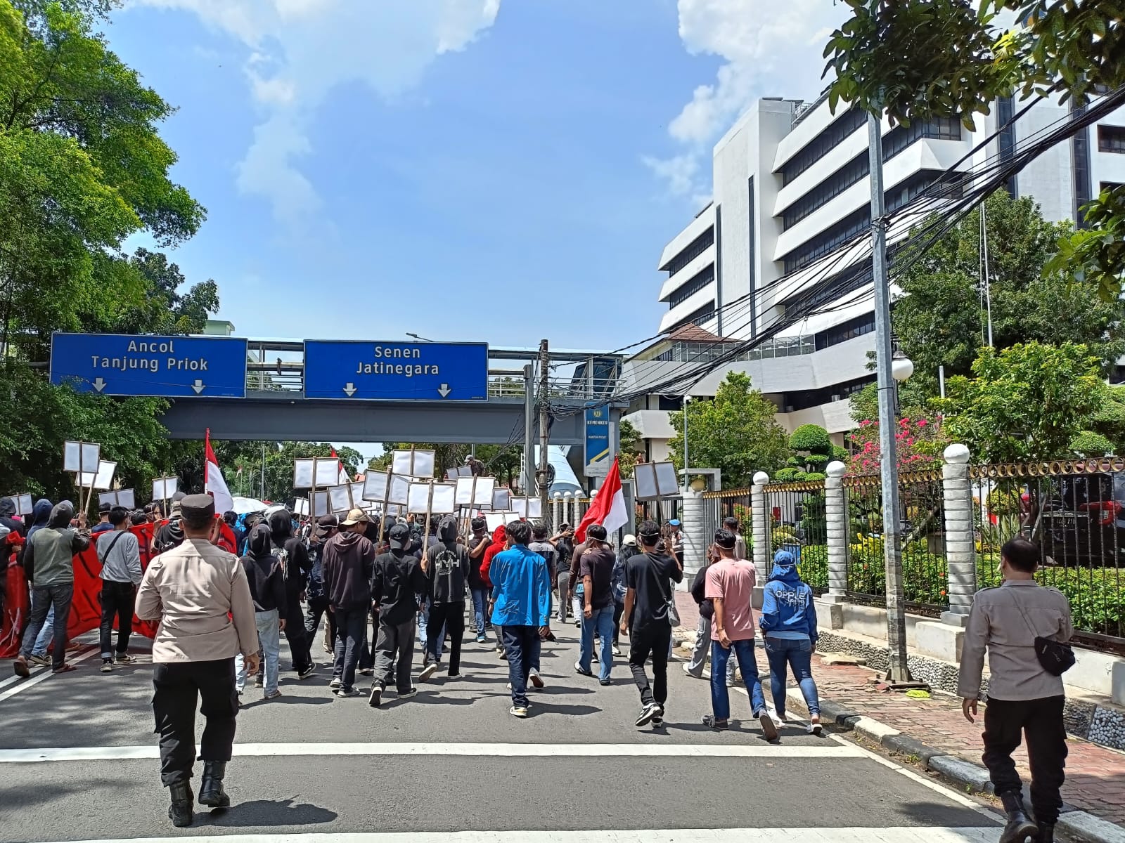 Kapolsek Sawah Besar, Kompol Rahmat Himawan, memimpin langsung pengamanan aksi tersebut dengan pendekatan humanis. Meski aksi tidak melalui prosedur pemberitahuan resmi ke kepolisian, petugas tetap memberikan ruang ekspresi terbatas selama tidak lebih dari 15 menit.
