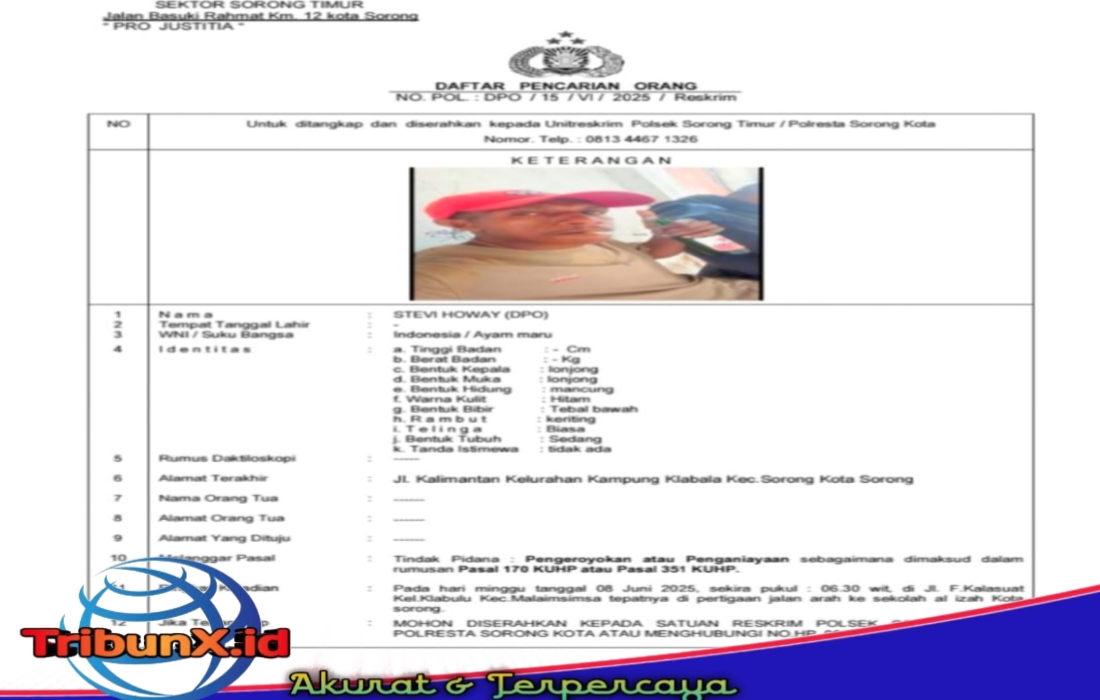 Kota Sorong|TribunX.id, Aksi pengeroyokan terjadi pada Minggu (08/06/2025) sekira pukul 06.30 WIT di Jalan F. Kalasuat, Kelurahan Klabulu, Kecamatan Malaimsimsa, tepatnya di pertigaan jalan arah ke Sekolah Al Izah, Kota Sorong. Peristiwa tersebut melibatkan dua pelaku, salah satunya masih berstatus Daftar Pencarian Orang (DPO).