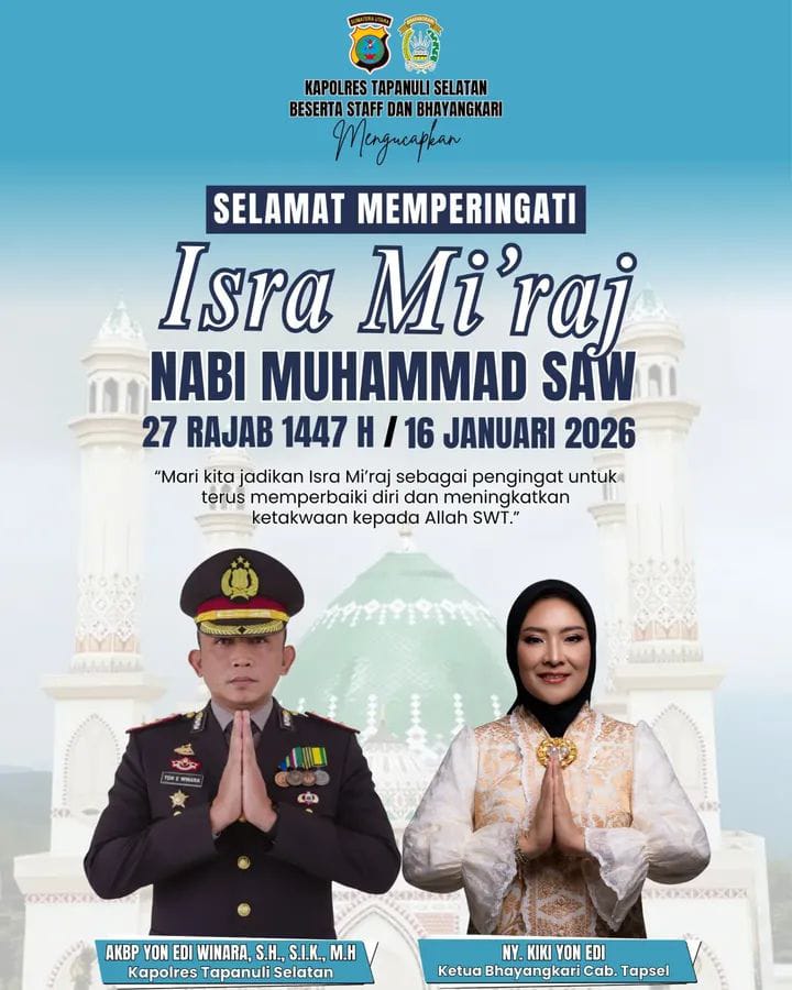 Kapolres bersama jajaran polres Tapanuli Selatan dan Bhayangkari menyampaikan ucapan selamat Isra Mi’raj sekaligus mengajak seluruh personil polri memperteguh keimanan dan ketaqwaan sebagai dasar moral dalam menjaga keamanan, melindungi masyarakat,serta mengabdi kepada masyarakat dan negara.