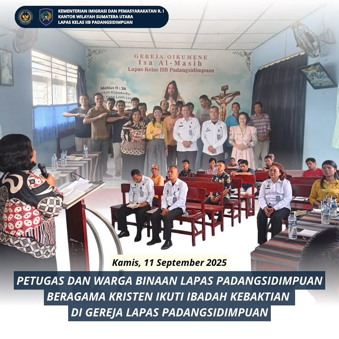 Padangsidimpuan |TribunX.id, Suasana khidmat dan penuh kekhusyukan tampak di Gereja Lapas Kelas IIB Padangsidimpuan pada Kamis (11/09/2025) saat petugas dan warga binaan beragama Kristen mengikuti ibadah kebaktian bersama. Ibadah kali ini dipimpin langsung oleh penyuluh Bimbingan Masyarakat (Bimas) Kristen dari Kementerian Agama (Kemenag) Kota Padangsidimpuan.
