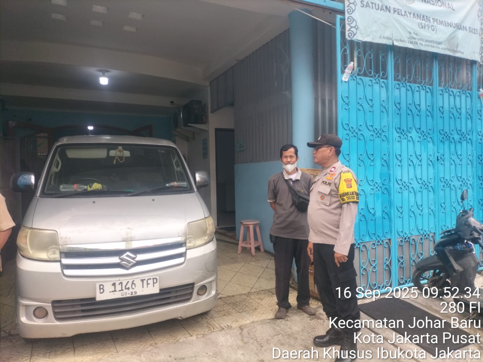 Jakarta Pusat|TribunX.id, Bhabinkamtibmas Kelurahan Johar Baru melakukan pengecekan langsung di Dapur SPPG Makan Bergizi Gratis (MBG) milik Yayasan Lumbung Berkah Anak Bangsa yang berlokasi di Jl. Kramat Jaya Baru F2 No. 295, Kelurahan Johar Baru, Kecamatan Johar Baru, Selasa (16/9/2025) pukul 10.00 WIB.