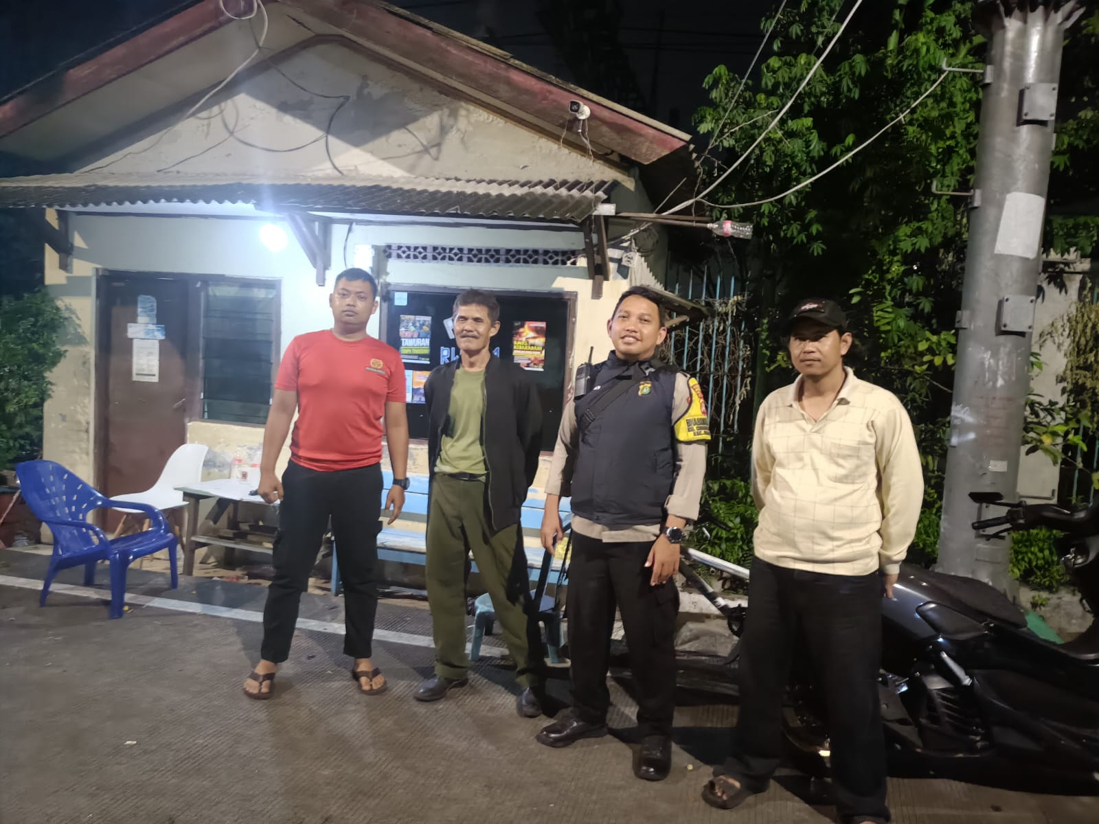 Pada Sabtu malam (3/5), Bhabinkamtibmas Kelurahan Gunung Sahari Utara, Aipda Adnan M, bersama Linmas setempat, Bapak Jaelani, melakukan patroli dan menyampaikan himbauan kamtibmas kepada warga di Poskamling Rw.04.