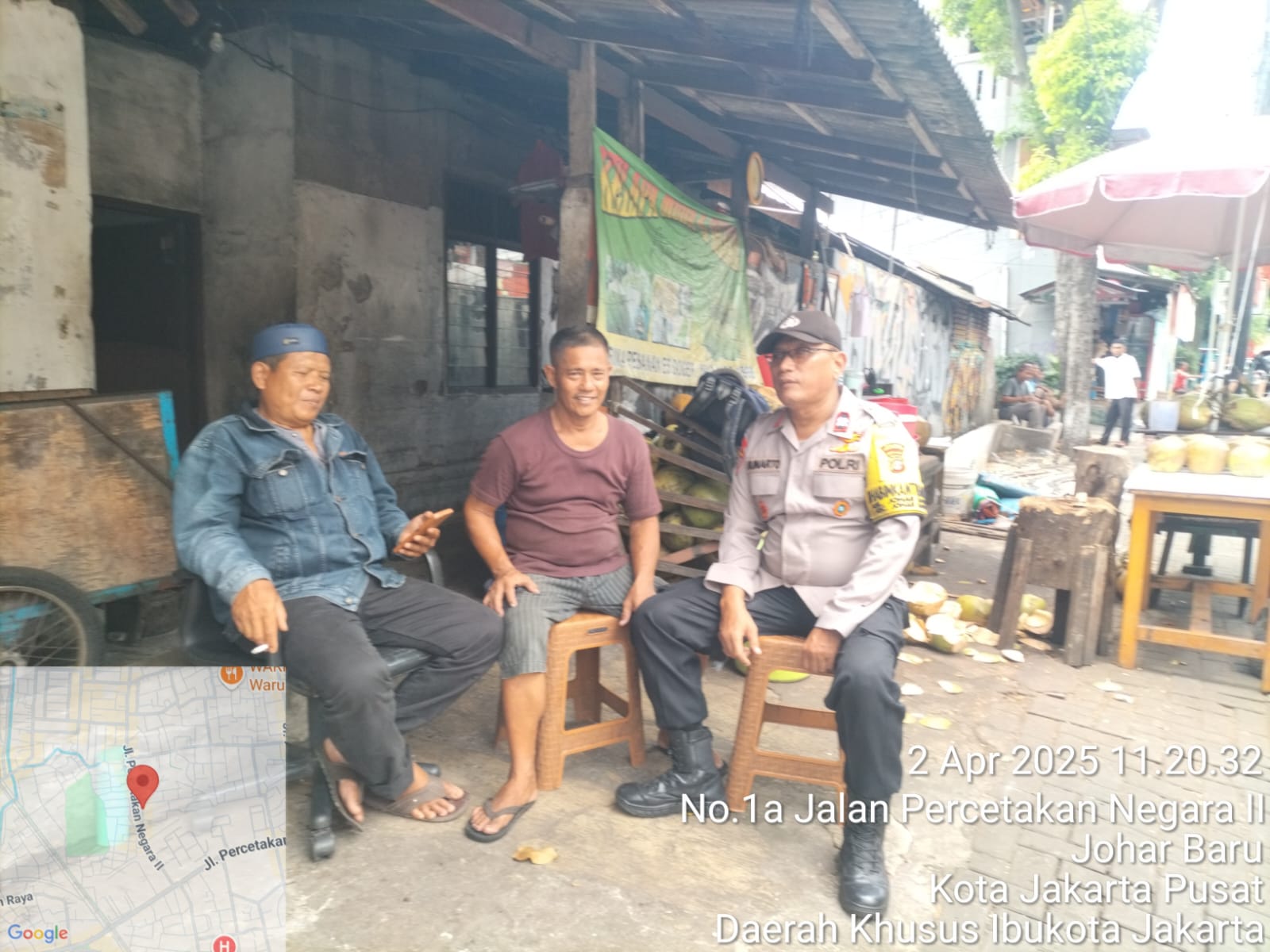 Jakarta Pusat]]TribunX.id 02 April 2025 – Dalam rangka menjaga keamanan dan ketertiban di wilayah Kelurahan Johar Baru, Bhabinkamtibmas Kelurahan Johar Baru Aiptu Sunarto melaksanakan kegiatan patroli dialogis dan cooling system di RW 06. Kegiatan ini berlangsung pada Rabu, 02 April 2025, pukul 12.00 WIB, bertempat di Jalan Percetakan Negara II, RW 06 Kelurahan Johar Baru, Jakarta Pusat. Kegiatan ini bertujuan untuk mempererat hubungan antara aparat kepolisian dan warga sekaligus meningkatkan kewaspadaan di lingkungan.