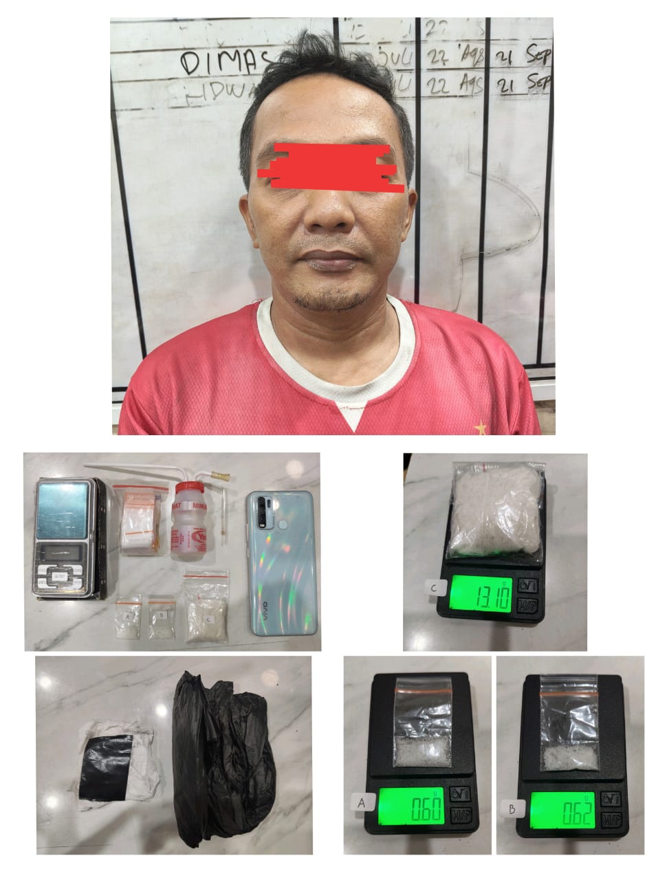 Saat dilakukan penggeledahan di rumah tersangka, petugas kembali menemukan barang bukti berupa satu klip plastik bening berisi sabu, satu unit timbangan digital, satu set alat hisap sabu, satu pak plastik klip bening, satu kantong plastik warna hitam, serta satu lembar kertas tisu yang dibungkus lakban hitam. Total barang bukti narkotika jenis sabu yang diamankan seberat 14,32 gram.