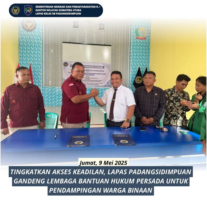 Padangsidimpuan]]TribunX.id, Dalam upaya meningkatkan akses keadilan bagi warga binaan, Lembaga Pemasyarakatan (Lapas) Kelas IIB Padangsidimpuan resmi menjalin kerja sama dengan Lembaga Bantuan Hukum (LBH) Persada, Kamis (9/5/2025). Penandatanganan nota kesepahaman ini berlangsung di aula utama Lapas dan dihadiri oleh Kalapas Padangsidimpuan Mathrios Zulhidayat Hutaoit, Ketua LBH Persada,Sahor Bangun Ritonga serta sejumlah pejabat terkait.