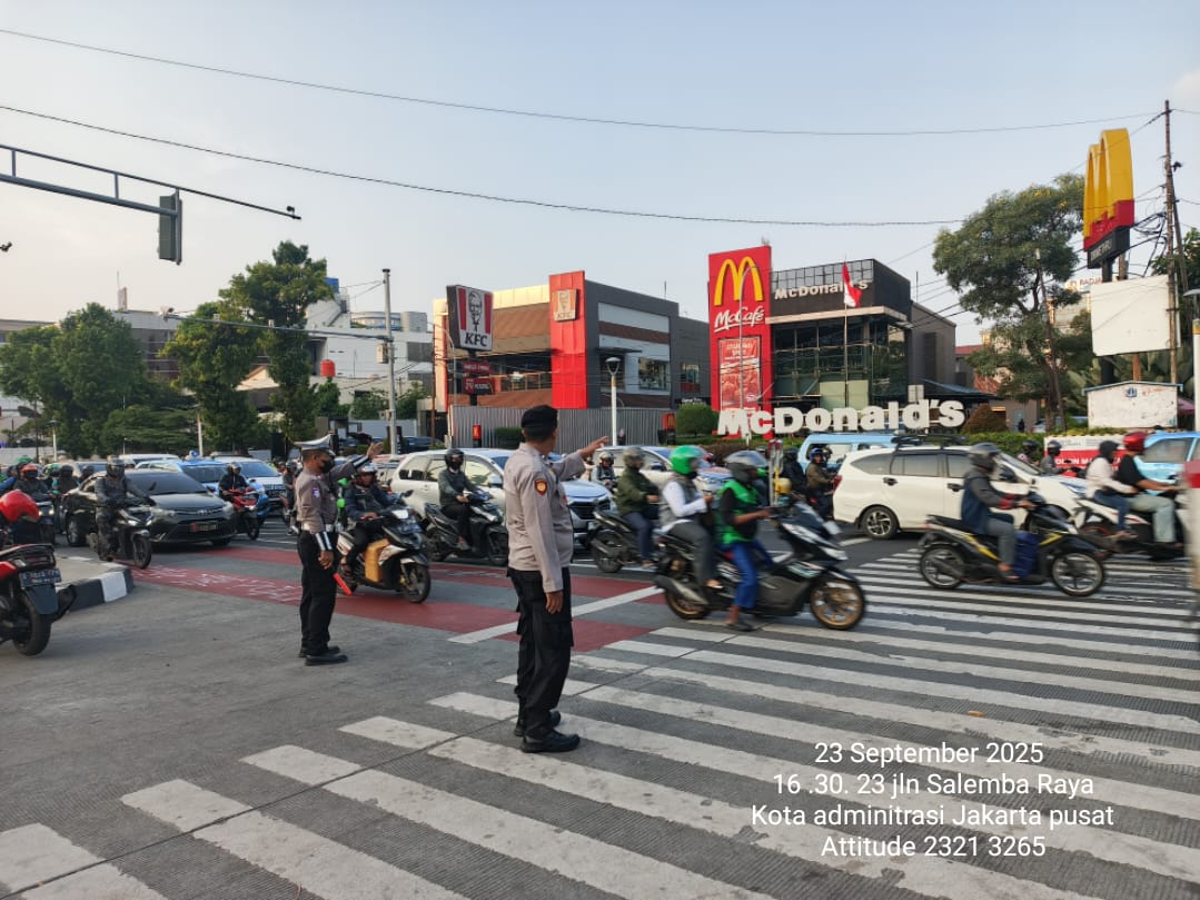 Jakarta Pusat|TribunX.id, Anggota Unit Samapta Polsek Senen melaksanakan pengaturan lalu lintas pada sore hari di kawasan Jalan Salemba Raya, Kelurahan Paseban, Kecamatan Senen, Jakarta Pusat, Selasa (23/9/2025).